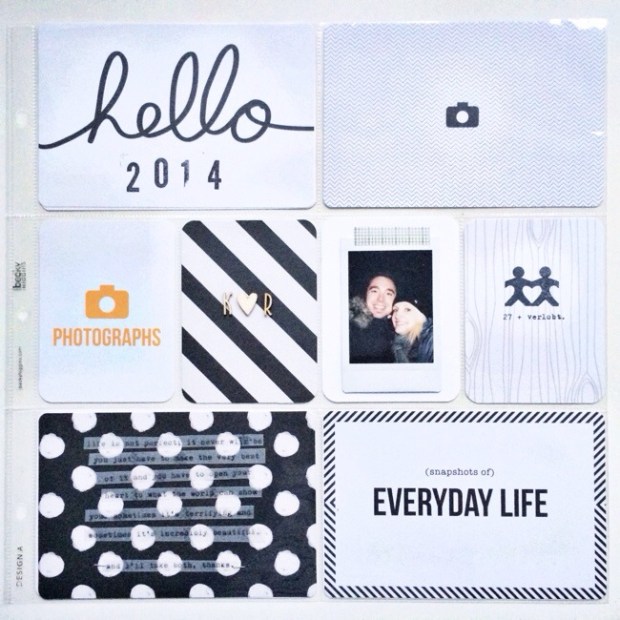Die Karten sind eigentlich alle von der Midnight Edition. Ein paar Sachen sind von Studio Calico Project Life Kits. Die beiden Figuren und die Jahreszahl ist gestempelt. Links unten habe ich dieses Zitat von Pinterest mit meiner Schreibmaschine abgeschrieben.