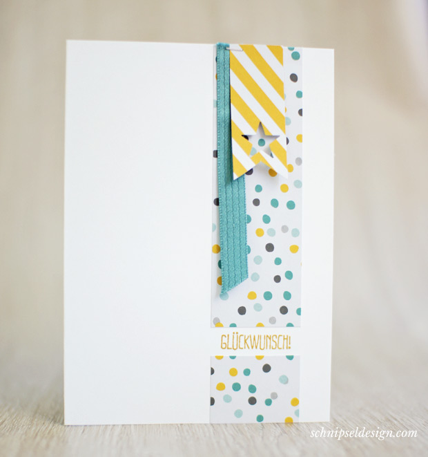 Zu sehen gibt es zum einen ein paar der neuen In Color Farben 2014 – 2016: Lagunenblau und Honiggelb. Das gepunktete und das gelb-gestreifte Designerpapier stammt aus dem neuen (kleinen) Designerpapier-Block Mondschein (definitiv ein Favorit). Der Stern wurde mit einer Stanze aus dem neuen 3er-Stanzen Paket Itty Bitty Akzente ausgestanzt. Das Band in Lagunenblau ist ebenfalls neu :-).