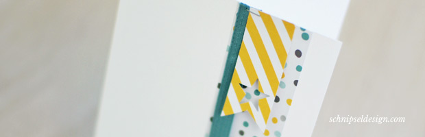 Zu sehen gibt es zum einen ein paar der neuen In Color Farben 2014 – 2016: Lagunenblau und Honiggelb. Das gepunktete und das gelb-gestreifte Designerpapier stammt aus dem neuen (kleinen) Designerpapier-Block Mondschein (definitiv ein Favorit). Der Stern wurde mit einer Stanze aus dem neuen 3er-Stanzen Paket Itty Bitty Akzente ausgestanzt. Das Band in Lagunenblau ist ebenfalls neu :-).