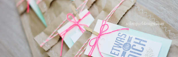 Vorne drauf noch einen netten Spruch aus dem Stempelset Wimpeleien in Anthrazitgrau auf einem weiteren Tag aka Anhänger, ein kleines Glitzer-Herz und ganz viel Neon-Pinke-Kordel ❤ (kommt auf den Bildern nicht so neon rüber, ist/war es aber).