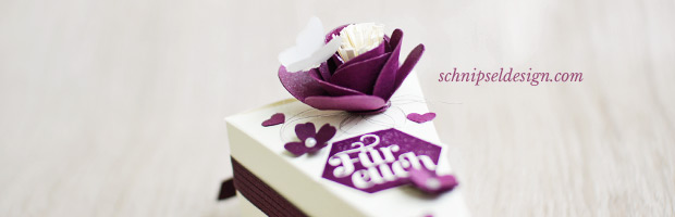 Und dieser kleine Schmetterlinge aus weißem Pergamentpapier (aka Vellum)? Einfach mit einem zusammengedrehten Klebepunkt als Körper auf ein Blütenblatt setzen. Die Blume wurde außerdem mit Smooch Spritz Vanille besprüht, wodurch sie eben schimmert. Geklebt wurde die Blüte mit Heißkleber.