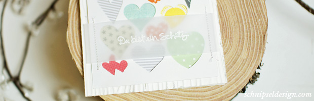 Hinter die Herzen hab ich einfach Designerpapier-Schnipsel nach Lust und Laune verklebt – einfach mal blind in die Kiste gegriffen und was rausgezogen. Da kombiniert man Farben und Muster die man so nie gemeinsam nehmen würde – trotzdem wirkt’s dann irgendwie stimmig. „Du bist ein Schatz“ kommt aus dem exklusiven Stempelset Gesammelte Grüße und wurde in weiß auf weißem Pergament/Transparentpapier embosst.