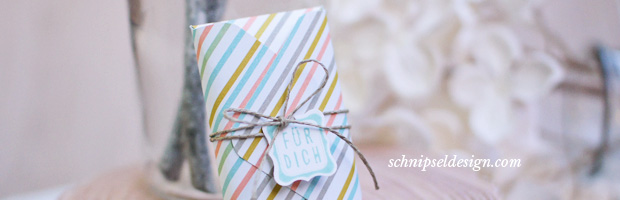 Ich hab für meine Schoki wieder das Designerpapier Süße Sorbets verwendet. „Für Dich“ kommt aus dem Stempelset Rosige Zeiten und wurde mit der passenden Mini-Etikett Stanze ausgestanzt.