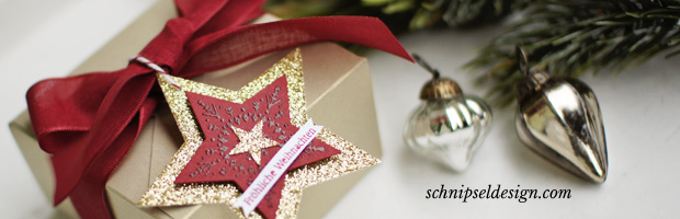 Als Basis habe ich hier einen Farbkarton in Mattgold verwendet. Runderherum ein Leinenband in Chili und ein kleiner Sternenanhänger.