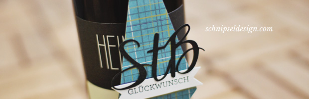 Falls sich jemand mehr für Wein interessiert als ich – es wurde ein Zweigelt 2012 von Heinrich. Aber kommen wir zum Wichtigsten – dem Geschenkanhänger. Dafür hab ich mir Designerpapier in Krawatten-Form zurechtgeschnitten … ok, von Plotty zuschneiden lassen – genauso wie den „StB“-Schriftzug (StB = Steuerberater).