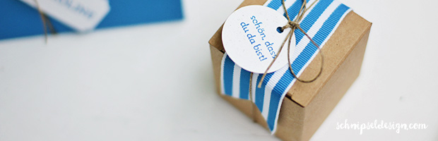 Gastgeschenke gab’s natürlich auch. Die kleinen Mini-Geschenkschachteln wurden mit Balla-Balla und Pico-Balla von Haribo gefüllt (es gab im Haribo Shop leider nichts das nach Fussball aussah, die klingen wenigstens danach). Noch ein passendes Band in Pazifikblau dazu, ein Anhängerchen drauf und fertig. Der Spruch kommt aus dem Stempelset Perfekte Pärchen.