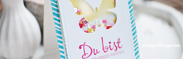 Ich weiß auch nicht, gestern war mir nach Bunt und nach Schüttelkarte. Ich mag ja Schüttelkarten, die haben irgendwie sowas leichtes, fröhliches. Und obwohl ich eigentlich schon ein schwarz-weißes Designerpapier für den Hintergrund zugeschnitten hatte, hab‘ ich dann doch noch umgeschwenkt, mutig wie ich bin, und für den Hintergrund den Stempel Handcarved in Türkis verwendet 🙂 Sie gefällt mir – bunt eben.
