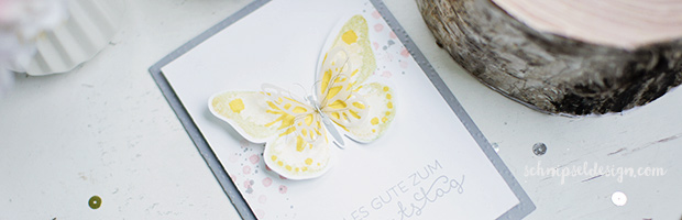 Und es wäre nicht Stampin‘ Up! würde es zum Stempelset nicht die passenden Stanzen geben würde 🙂 Dazu hab ich noch den kleineren Schmetterling aus weißem Pergament ausgestanzt. Noch ein bisschen Metallic-Flair Garn in Gold dazu und soweit fertig.