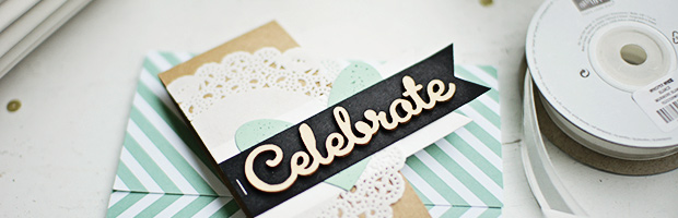 Farblich sind wir in Minzmakrone (aus dem Designerpapier-Block) und Schwarz. „Celebrate“ ist ein Holzfurnier aus dem Set Natur-Elemente Wortwörtlich. Dahinter liegt ein Herz (Kesi Art) und ein ¾ Papier-Spitzendeckchen.