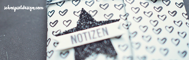 Der Rest der Deko ist sehr simpel gehalten. Ein mittelgroßer schwarzer Glitzer-Stern und ein ausgestantztes „Famoses Fähnchen“ mit dem Stempelabdruck „Notizen“ aus dem Stempelset Momente wie diese.