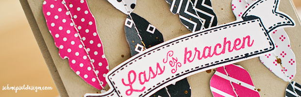 Wenn du dich jetzt fragst – verdammt, wo kommen die Federn her? Dann liegt die Antwort im Framelits Set Pflanzen-Potpourri, denn eines der Blätter geht locker als Feder durch, oder? Das Stempelset ist übrigens auch neu und heißt Geburtstagsbanner.