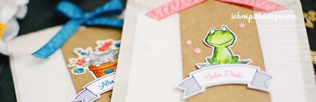 In Kombination zu den neuen Pergamin-Geschenktüten, die ich jeweils vorher mit der Big Shot und den neuen Prägefoldern Meereswellen und Blättermeer geprägt habe, machen sich die Tags ziemlich gut. Ich mag so Tütchen immer gern – ich füll sie dann mit Pailletten und Konfetti – gebe kleine Geschenke, Glückwünsche, Gutscheine oder Geld hinein. Die gehen halt einfach immer – und mit dem Stempelset hat mach auch einen tollen Spruch für viele dieser Gelegenheiten.