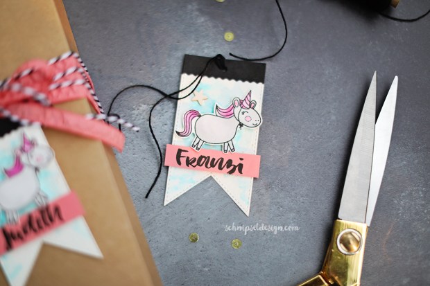 So sah mein Special Swap dann von außen aus – verwendet hab ich für den Anhänger das Einhorn* (aka Party-Pferd) von PAPIERPROJEKT. Die Namen sind per Hand geschrieben.