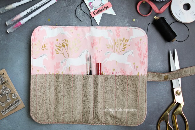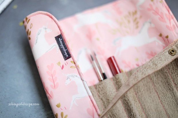 Innen drin versteckt sich dann eine Pinselrolle für kleine Pinsel – ich mach ja immer gerne etwas Praktisches 🙂 Die Anleitung dafür hab ich auf Makerist gekauft. Das restliche Material über Grinsestern. Den Einhorn-Baumwollstoff gibt’s leider nicht mehr – heißt aber Magic Unicorn Forrest von Michael Miller. Für die Pinselhalterung hab ich Kunstleder verwendet.