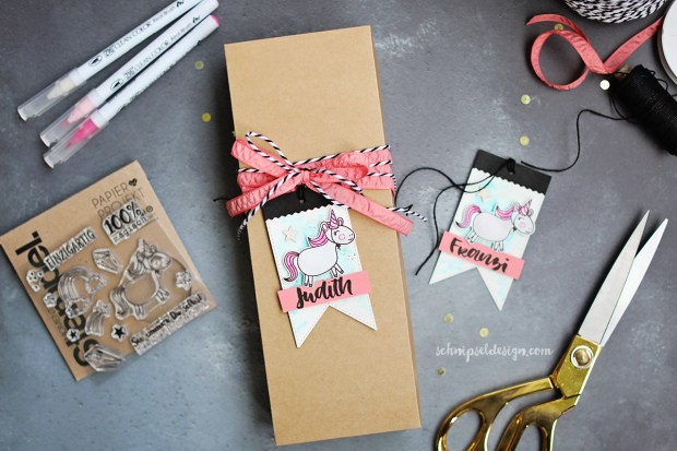So sah mein Special Swap dann von außen aus – verwendet hab ich für den Anhänger das Einhorn* (aka Party-Pferd) von PAPIERPROJEKT. Die Namen sind per Hand geschrieben.