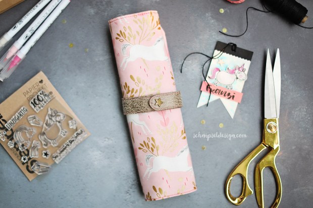 Innen drin versteckt sich dann eine Pinselrolle für kleine Pinsel – ich mach ja immer gerne etwas Praktisches 🙂 Die Anleitung dafür hab ich auf Makerist gekauft. Das restliche Material über Grinsestern. Den Einhorn-Baumwollstoff gibt’s leider nicht mehr – heißt aber Magic Unicorn Forrest von Michael Miller. Für die Pinselhalterung hab ich Kunstleder verwendet.