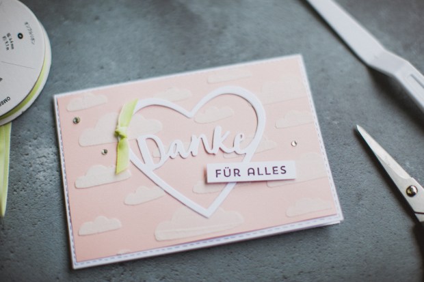 Mixed Media – quasi wie der „Achtsamkeits-Trend“ anderswo nur in der Bastel-Szene. Wikipedia sagt dazu: „Der Begriff Mixed Media steht in der bildenden Kunst für die Verwendung unterschiedlicher Medien bei der Erstellung eines Werkes.“ In meinem Fall – Papier, Band, Embossing-Paste, Stift und Strasssteine. Das gilt, würd ich sagen.
