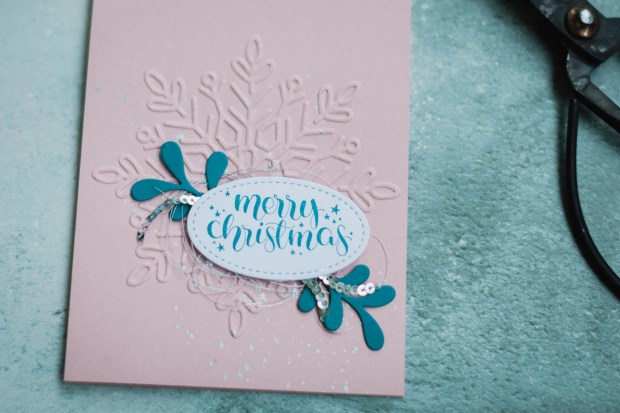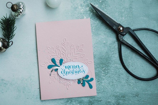 Es galt etwas in untypischen Weihnachtsfarben zu basteln. Die sind ja heuer für mich schwarz, weiß mit Kraft oder Grün. Hier also etwas untypisch für Weihnachten: Puderrosa kombiniert mit Petrol. Mir gefällts 🙂