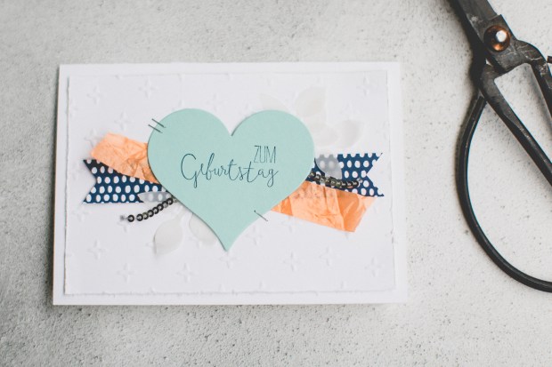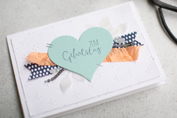 Die Grundform/Anordnung der Karte mag ich sehr gern – wir hatten eine ähnliche irgendwann mal für die Hilfe beim Onstage bekommen – seit dem arbeite ich gerne nach dem Sketch. Ich habe das Thema mal für mich soweit ausgelegt, dass unter „Blüttenblätter“ auch Blätter im Allgemeinen zählen. Es finden sich daher Blätter aus Transparentpapier dezent im Hintergrund.