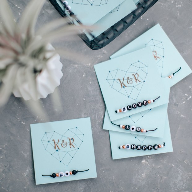 Zum Durchfädeln des Bandes hab ich nur zwei kleine Löcher gemacht und fertig. Die Worte waren sehr allgemein für alle gehalten – mein persönlicher Favorit war trotzdem das #♥.