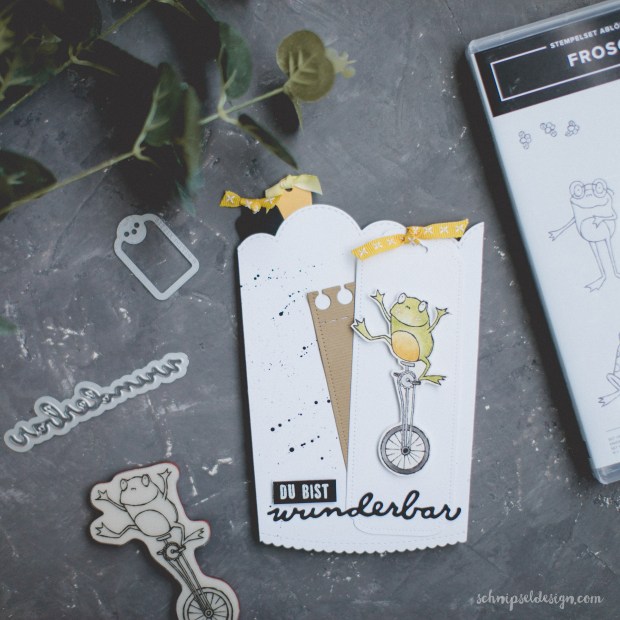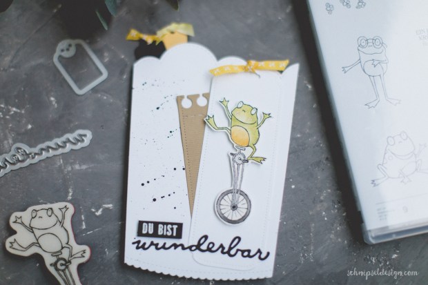 Die Thinlits Wunderbar gab’s letztes Jahr in der Sale-A-Bration und finden sich mittlerweile regulär im Katalog. Quasi doppelt SAB hier. Macht sich das „wunderbar“ nicht toll hier? „Du bist“ ist in einzelnen Buchstaben mit dem Set Aus der Kreativwerkstatt gestempelt/embosst.
