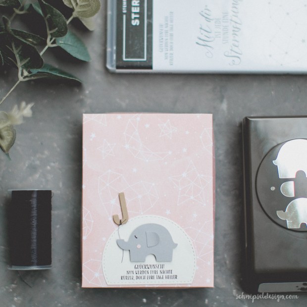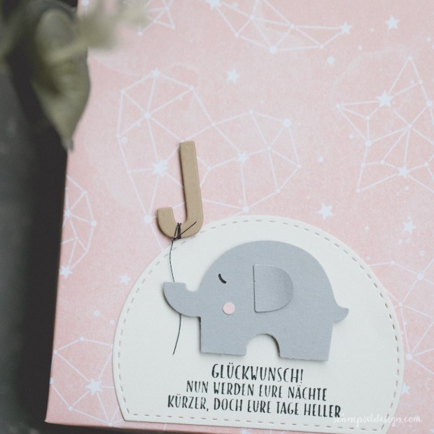 Vor allem mag ich aber den süßen kleinen Elefant ❤ er hält wie einen Buchstaben-Luftballon den Anfangsbuchstaben des Babies (die Stanze ist von Lawn Fawn).