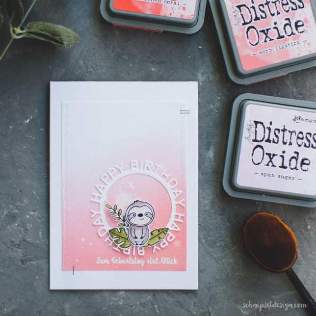 Für den Hintergrund habe ich die folgenden Distress Oxide Inks verwendet: spun sugar, worn lipstick und abandoned coral*. Zum Blenden verwende ich am liebsten das Bristol Papier*. Ausgestanzt ist der Hintergrund mit einer Stanze aus dem Sew Fancy Set von Mama Elephant.
