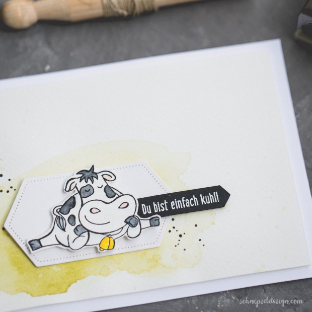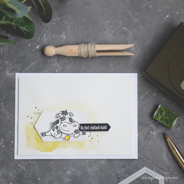 Meine Karte ist recht schlicht gehalten – Aquarellpapier und etwas Olivgrün drauf mit Sprenkeln. Die süß-träumende Kuh ist einfach mit StazOn gestempelt und dann mit dem Aqua Painter bemalt.