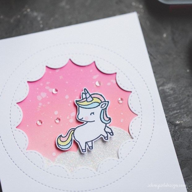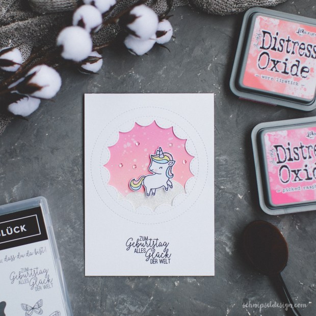 Manche sind vielleicht schon durch mit dem Einhorn-Thema … ich irgendwie noch nicht. Und das ist leider auch besonders hübsch (Lawn Fawn – A Little Sparkle). Der Hintergrund ist wieder mit dem Make-Up Pinselset* (eigenen sich so super für Verläufe) eingefärbt – verwendet habe ich die Distress Oxide Inks in picked raspberry* und worn lipstick*.