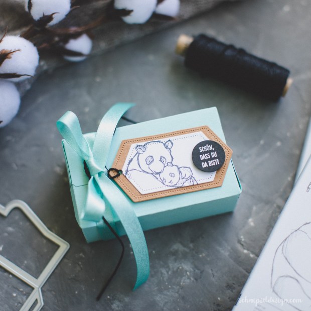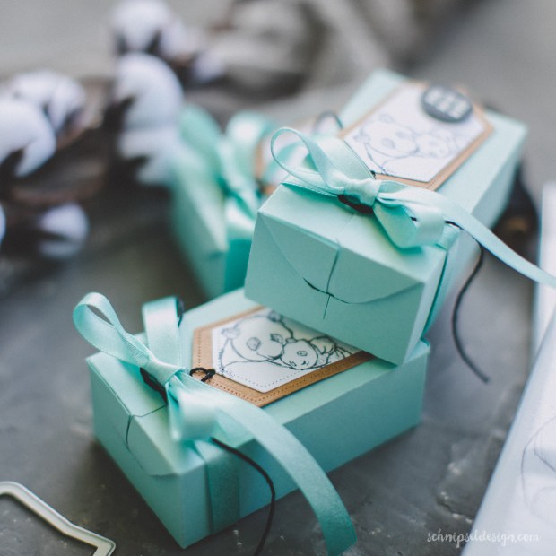 Gemacht waren sie aus Farbkarton in Aquamarin – kombiniert dazu (noch aus dem alten Katalog) das passende Schimmernde Geschenkband. Für den Anhänger wollte ich unbedingt das neue Set Im Babyglück verwenden. Wie süß sind denn die alle?