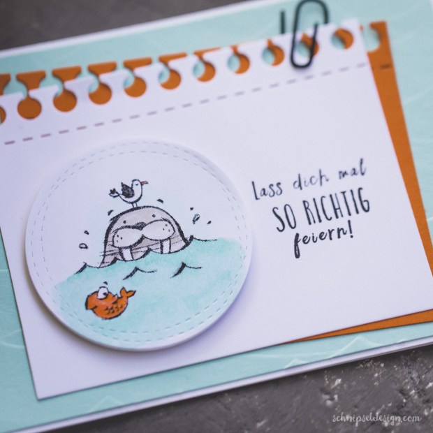 Die Grundkarte ist wieder mit dem neuen Prägefolder Stürmische See geprägt. Kombiniert hab ich das Walross mit der Briefklammern-Stanze aus den Stanzformen Kunsthandwerk.