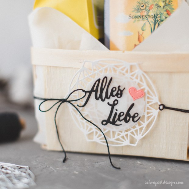 Ganz im Sinne von Upcycling kann ich die schönen Holzkisten in denen so manches Obst daher kommt einfach nicht wegwerfen sondern will es wiederverwerten. Ganz so wie hier. In dieser hübschen Box kamen einst Physalis … und jetzt wurde es zu einem kleinen Geschenkkorb umfunktioniert – da braucht es auch nicht viel dazu.
