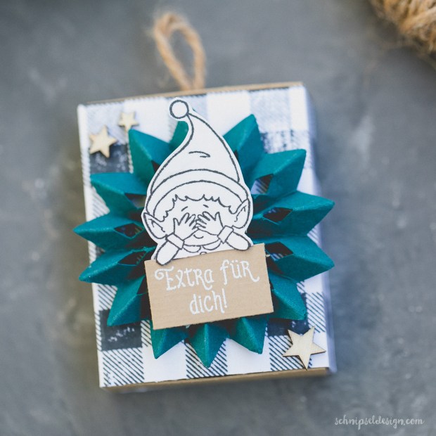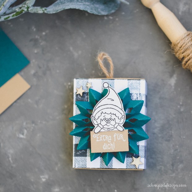 Die Rosette ist aus Farbkarton in Pfauengrün und mit der Cameo geschnitten (mit diesem Design). Oben drauf ist der kleine Elf aus dem Stempelset #Weihnachtself – ganz große Liebe hier für dieses Stempelset. Den ursprünglichen Spruch unter ihm hab ich gegen einen anderen ausgetauscht – hat mir besser gefallen. Zusammengesetzt ist alles mit der Heißklebepistole (ich hab eine ohne Kabel und liebe sie).
