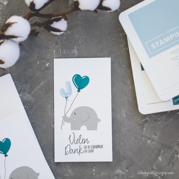 Der kleine schiefergraue Elefant hält zwei Luftballons von Mama Elephant (Balloon Letters und Balloon Et Cetera) – gestempelt in Rauchblau und Pfauengrün. Der Spruch ist leider aus einem nicht mehr aktuellem Stempelset (Danke für alles).