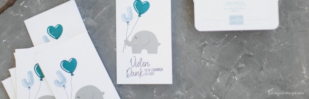 Der kleine schiefergraue Elefant hält zwei Luftballons von Mama Elephant (Balloon Letters und Balloon Et Cetera) – gestempelt in Rauchblau und Pfauengrün. Der Spruch ist leider aus einem nicht mehr aktuellem Stempelset (Danke für alles).