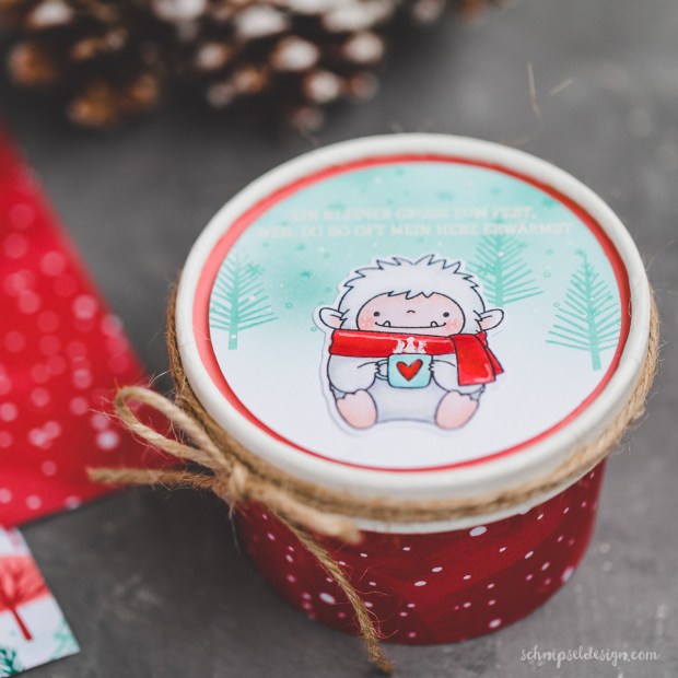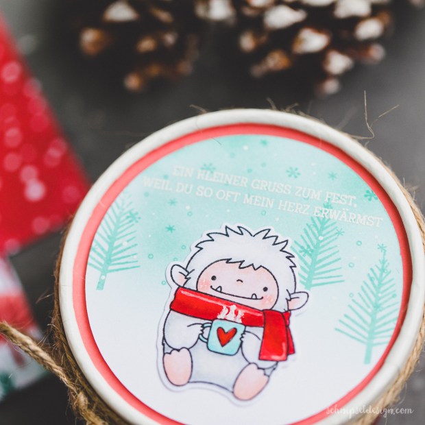 Der Spruch („Ein kleiner Gruß zum Fest, weil du so oft mein Herz erwärmst“) kommt, wie schon erwähnt, aus dem Stempelset Weihnachtstassen und ist in weiß embosst. Die weißen Schneeflocken-Punkte setze ich immer mit dem Molotow One4All Marker in Weiß (1,5 mm). Der kleine Yeti ist mit Copic coloriert.