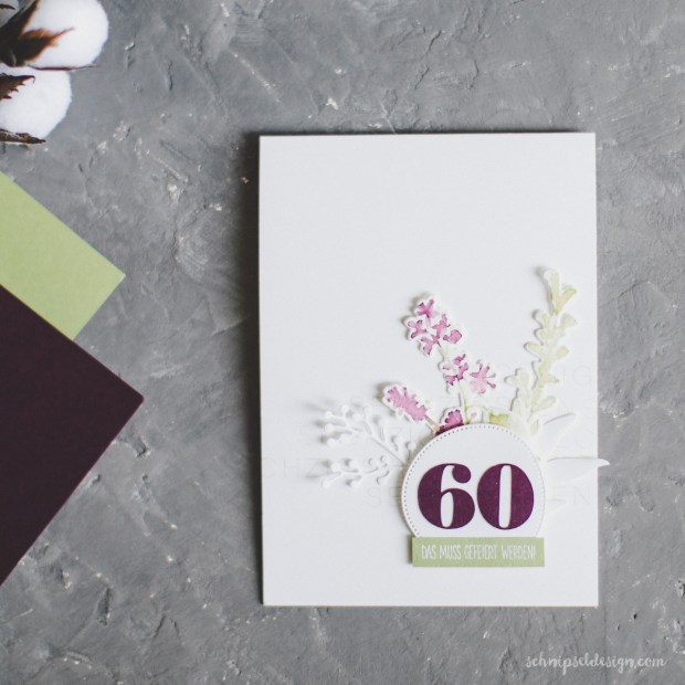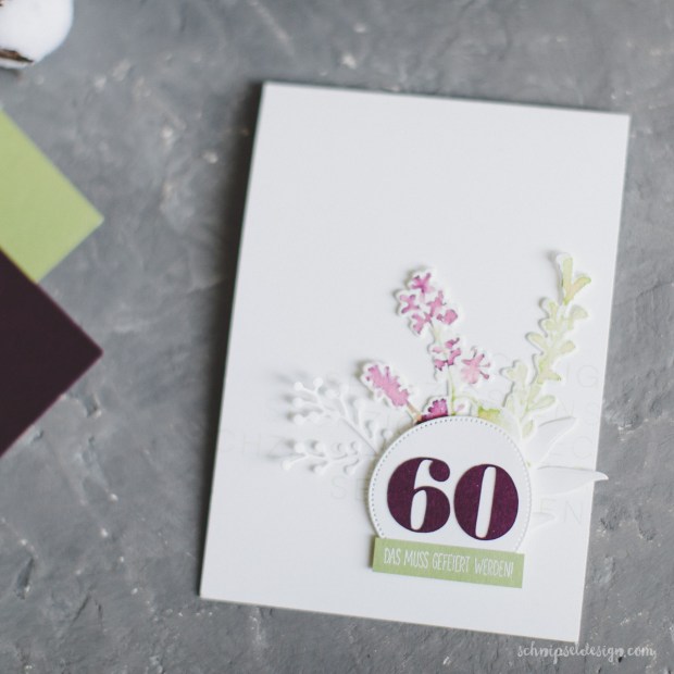 Passend zur 60iger Einladung, hab ich versucht eine Glückwunsch-Karte zu gestalten. Das Lila (hier Brombeermousse) war also gesetzt. Blumen auch – daher wurde es mit Farngrün kombiniert.
