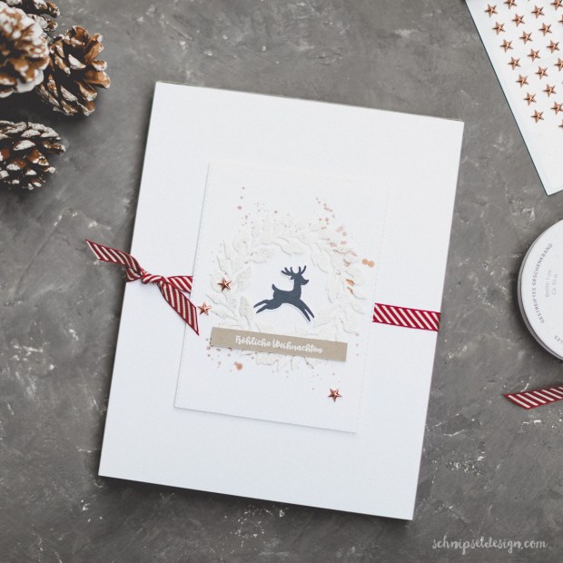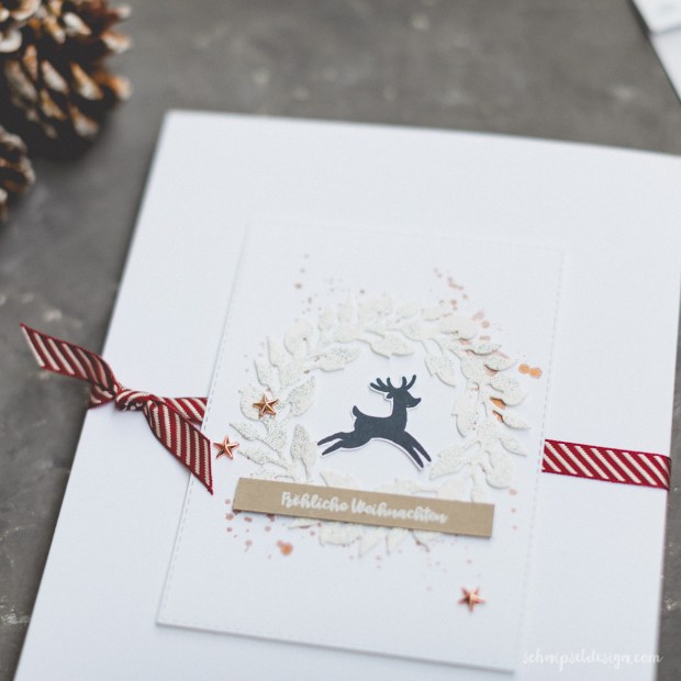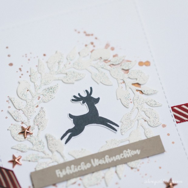 Ich hab mir den Kranz aus den Stanzformen Grüner Kranz mit der Big Shot* ausgestanzt und nur etwas über das VersaMark gestrichen und dann das neue Embossing-Pulver in Schimmerweiß drauf geschüttet. Im Hintergrund hab ich ein paar Spritzer mit der Delicata Metallic-Tinte in Kupfer gestempelt (mit dem alten Gorgeous Grunge Stempelset).