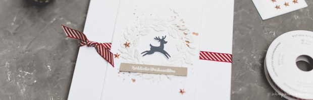 Ich hab mir den Kranz aus den Stanzformen Grüner Kranz mit der Big Shot* ausgestanzt und nur etwas über das VersaMark gestrichen und dann das neue Embossing-Pulver in Schimmerweiß drauf geschüttet. Im Hintergrund hab ich ein paar Spritzer mit der Delicata Metallic-Tinte in Kupfer gestempelt (mit dem alten Gorgeous Grunge Stempelset).