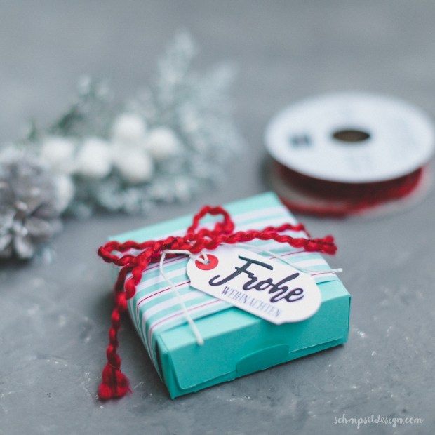 Ich hab dem „Frohes“ aus den Stanzformen Wunschworte wieder das „s“ abgeschnitten und es gemeinsam mit dem Stempel auf das Etikett gebracht.