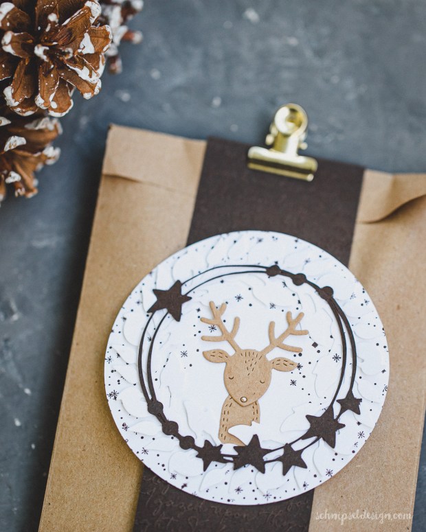 Der Kreis ist bestempelt mit den Schneeflöckchen/Punkten aus dem Stempelset Christmas Countdown. Darauf noch ein ausgestanzter Kranz aus den Stanzformen Grüner Kranz und ein von Plotty geschnittener Sternenkranz (dieses Design).