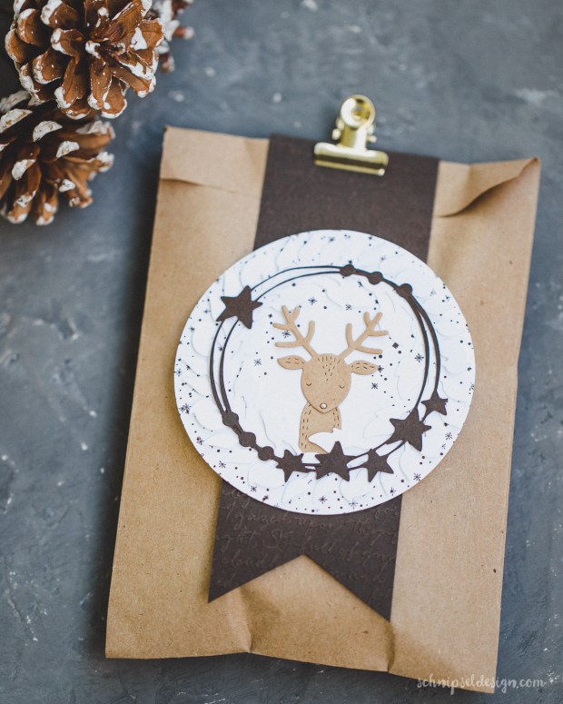 Das war die Verpackung dazu – gehalten in Espresso und Kraft. Der Banner ist unten mit der dreifach einstellbaren Fähnchenstanze gestanzt und mit dem 3-D Prägefolder Schreibschrift geprägt.