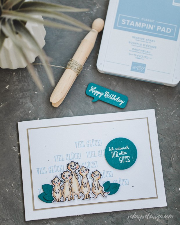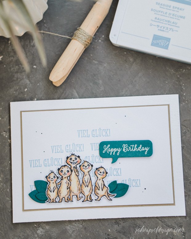 Nach der Weihnachtspause geht’s auch bei unserem Blog Hop in eine neue Runde. Wir haben uns auf die Sale-a-Bration geeinigt – konkret auf das Stempelset Von uns allen. Ganz große Erdmännchen Liebe hier. Das Einzige was mich hier stresst ist, dass ich es irgendwie geschafft habe den Stempel mit Text „Zum Geburtstag viel Glück und Freude“ zu verduppern … ich find ihn nicht mehr. Dachte ja eigentlich ich hab ihn wohl falsch eingeklebt, aber nein, nirgends, nada, nix. Naja, hoffen wir also, dass er wieder auftaucht.