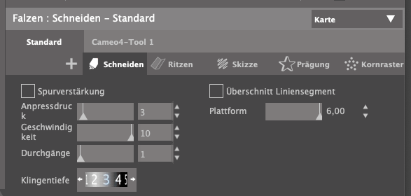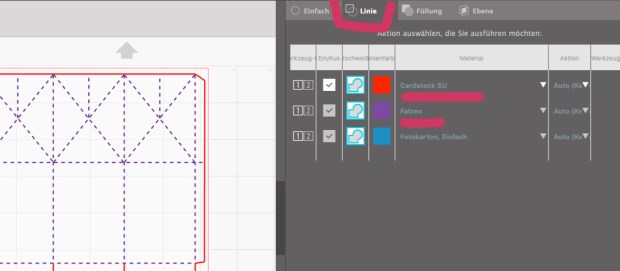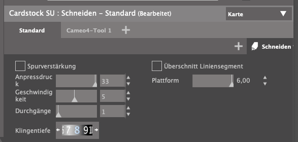 Ich habe mir quasi zwei eigene „Material“-Arten angelegt – Cardstock SU und Falzen – die ich dann entsprechend auswähle.