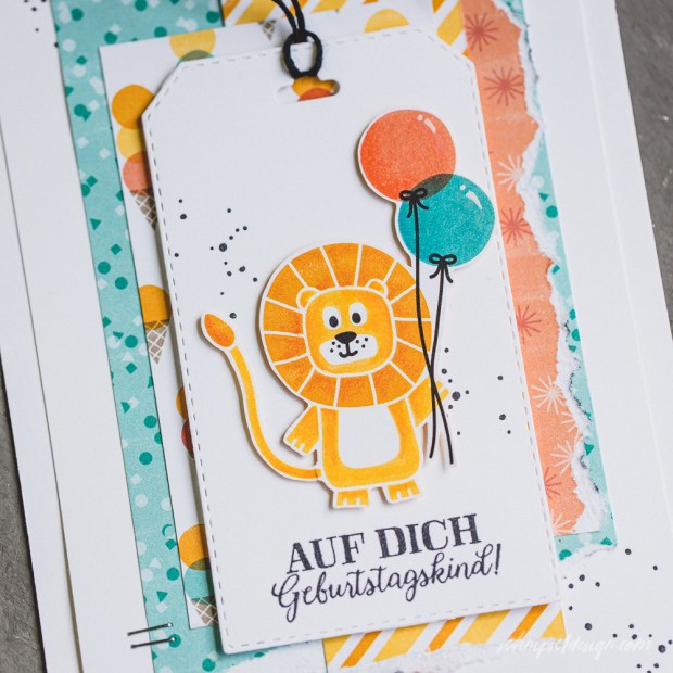 Der Löwe ist aus dem Designerpapier Bunter Geburtstag ausgeschnitten und mit den Polychromos* nachgezeichnet – das geht einfach soooo gut. Pssssst … Lieb ich fast mehr als das gestempelte Motiv.