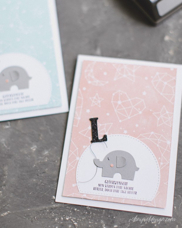 Das Designerpapier ist leider nicht mehr aktuell (war aber definitiv eins meiner Favoriten – genannt Sternenhimmel). Passend dazu das Stempelset Sternstunden und die Elefanten Elementstanze.