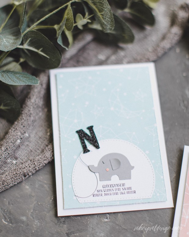 Das Designerpapier ist leider nicht mehr aktuell (war aber definitiv eins meiner Favoriten – genannt Sternenhimmel). Passend dazu das Stempelset Sternstunden und die Elefanten Elementstanze.