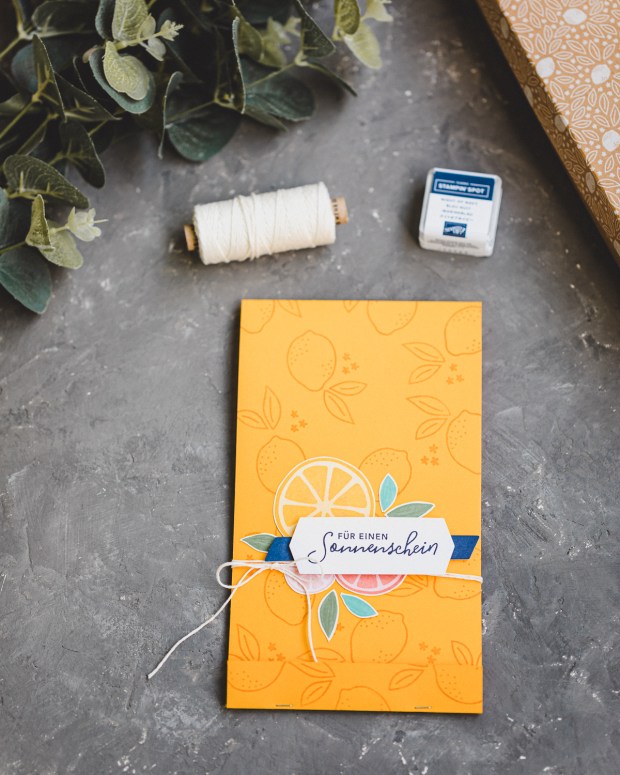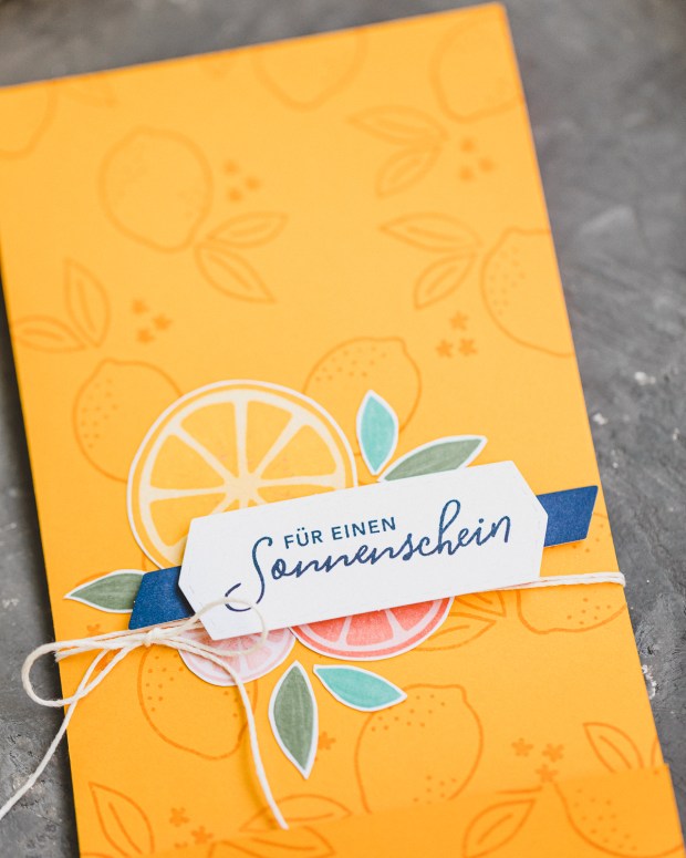 Die Orangen hab ich aus einem der Deko-Kärtchen ausgeschnitten. Zusätzlich zum Kartenkit braucht man daher eigentlich nur Mangogelben Farbkarton und das passende Stempelkissen. Einen Tacker braucht man auch – aber den hat man vermutlich schnell mal daheim.