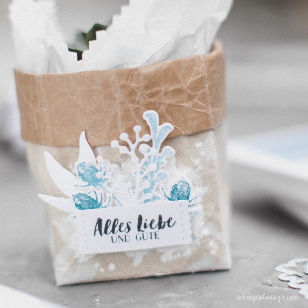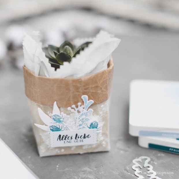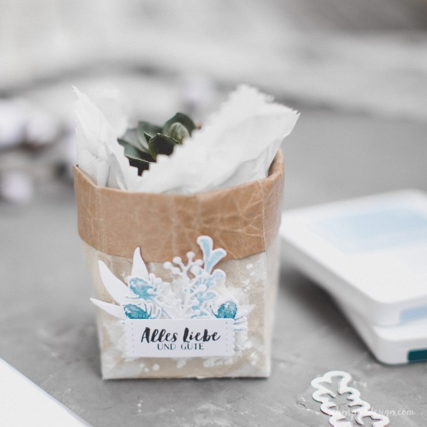 Verwendet hab ich das Stempelset Eisblüten mit dem passenden Stanzformen Winterbouquet. Das Etikett kommt aus den Stanzformen Bestickte Etiketten. Damit ich bei den Disteln einen leichten Farbverlauf bekommen, hab ich mit einem Fingerschwämmchen etwas Pfauengrün bei den Blüten aufgetupft – der Rest ist Rauchblau.