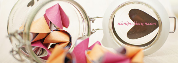 Beim Anhänger hat mir Plotty geholfen, man kann aber auch einfach den Umriss von einem Einmachglas ausdrucken, nachzeichnen und ausschneiden und mit der Big Shot ein Herz ausstanzen. Am Ende der Kordel noch zwei (eigentlich vier – vorne und hinten jeweils eins) Herzen aus Glitzerpapier in Champagner – ausgestanzt mit der Herzen-Bordürenstanze und schon ist eine kleine Aufmerksamkeit fertig.